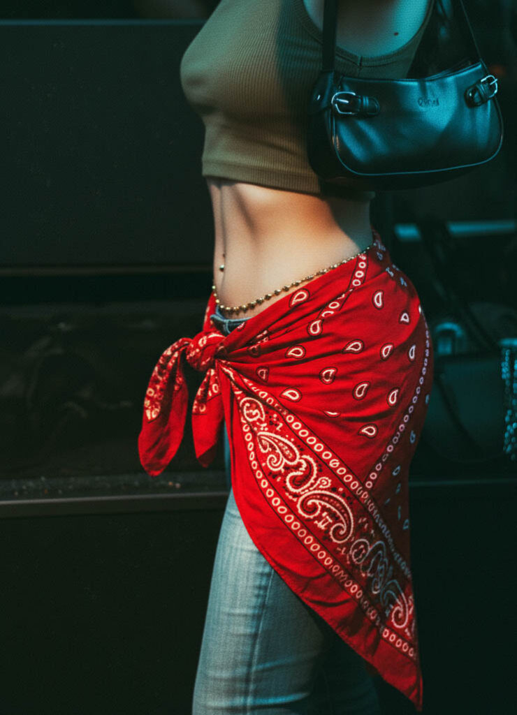 Perhaps the boldest choice is tying a large bandana around the chest as a top, leaving the shoulders and back exposed. This is an ideal choice for outdoor music events or seaside trips. For a more modest look, layer it over a white T-shirt or wear it diagonally across one shoulder.