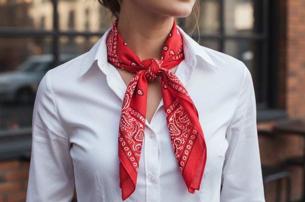 A bandana around the neck is a chic solution. Tying it with a simple knot in the front adds a touch of effortless “cool” to a basic outfit.