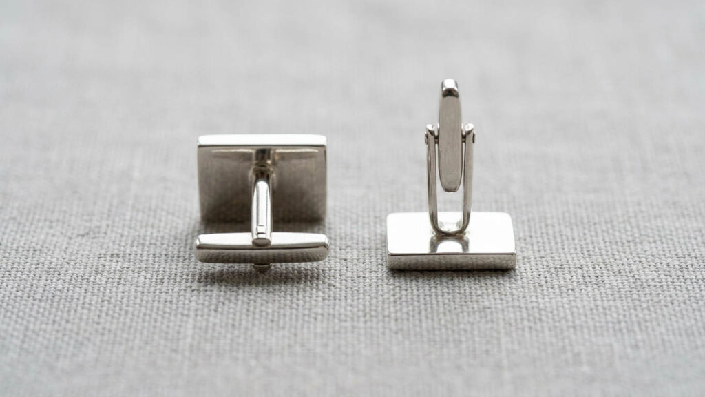 Важно, что декоративная (красивая) сторона запонок должна располагаться на внешней стороне запястья, а техническая сторона (фиксирующая ножка) — на внутренней.